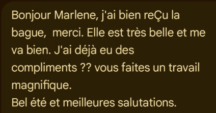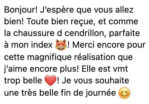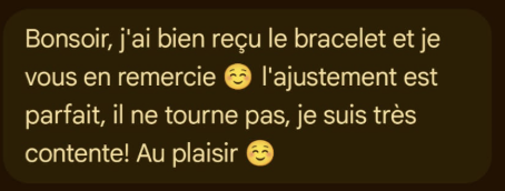 Je comprends que ce soit un achat important. Si tu n’es pas satisfaite, tu peux m’écrire sous 14 jours et on trouvera une solution (échange, ajustement, remboursement). Par contre, les bijoux sur mesure ne sont ni repris, ni échangés.