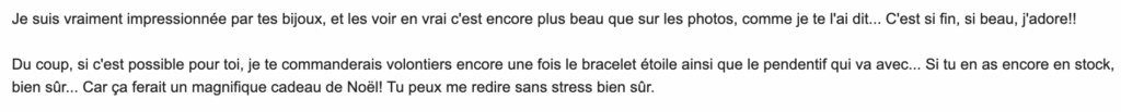 Chaque bijou est fabriqué à la main en Suisse avec de l’argent 925 et de l’argent fin (ou de l’or). Mes clientes me disent souvent qu’elles sont surprises par la finesse et la légèreté quand elles les reçoivent (tu peux voir leurs avis sur mon site). En cas de problème, n’hésite pas à me contacter.